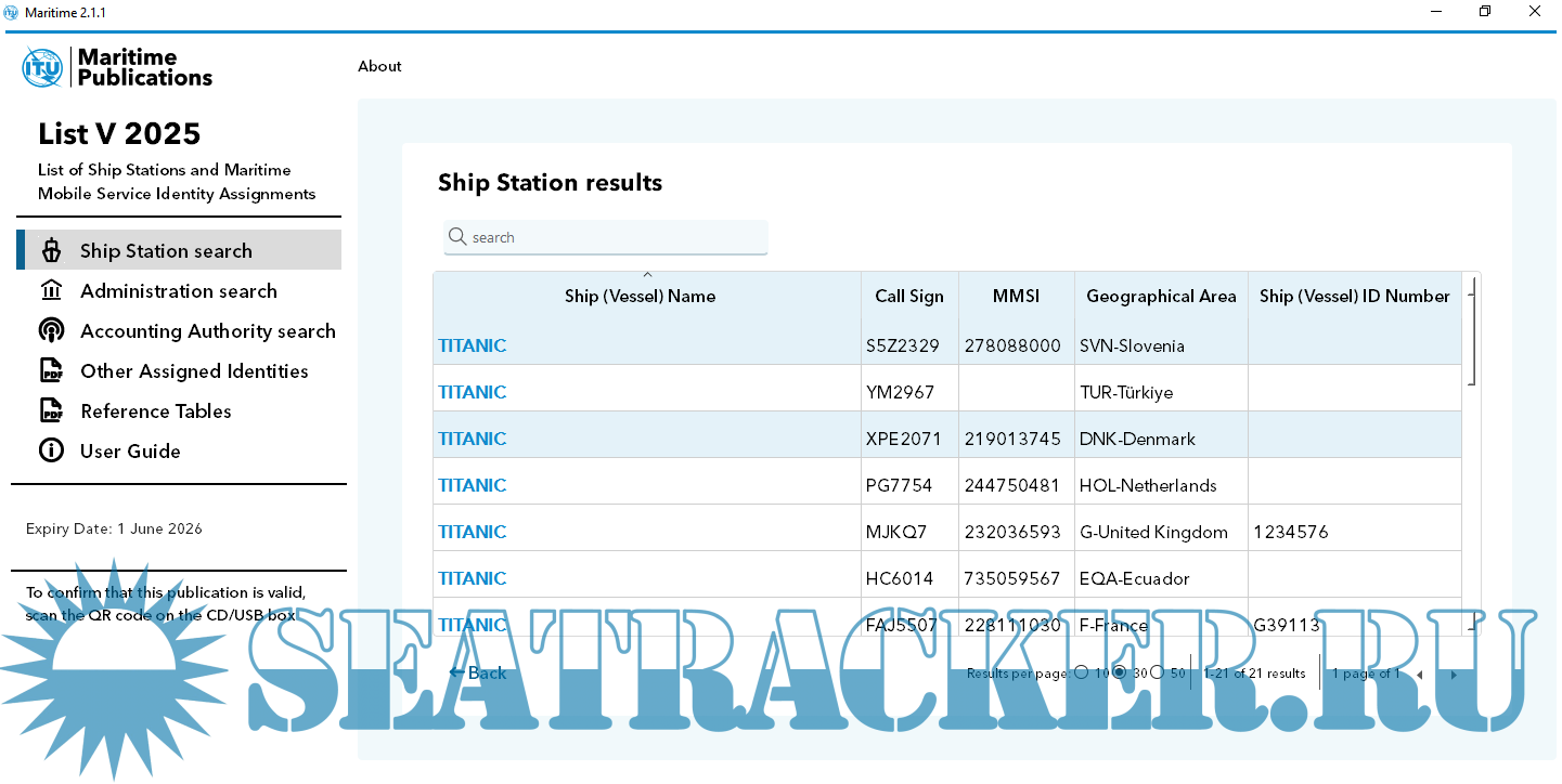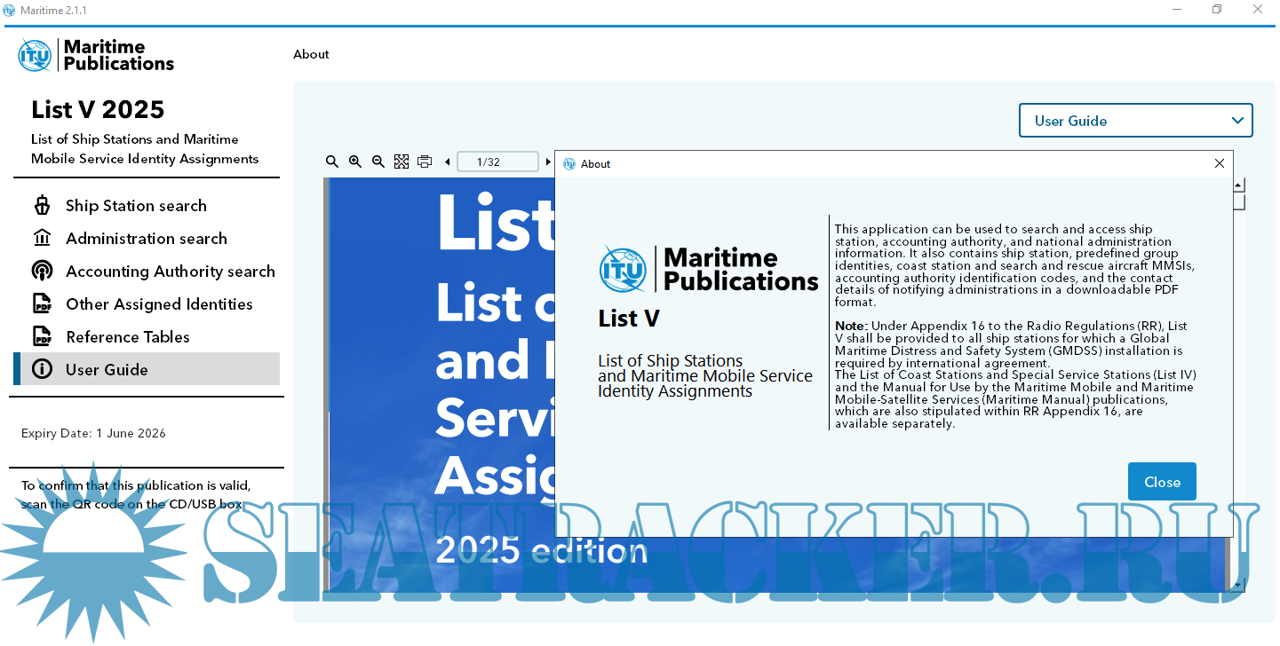 The List of Ship Stations and Maritime Mobile Service Identity Assignments (List V) is a service publication prepared and issued, once a year, by the International Telecommunication Union (ITU), in accordance with provision no. 20.8 of the Radio Regulations (RR). As stipulated in Appendix 16 to the RR, this List shall be provided to all ship stations for which a Global Maritime Distress and Safety System (GMDSS) installation is required by international agreement