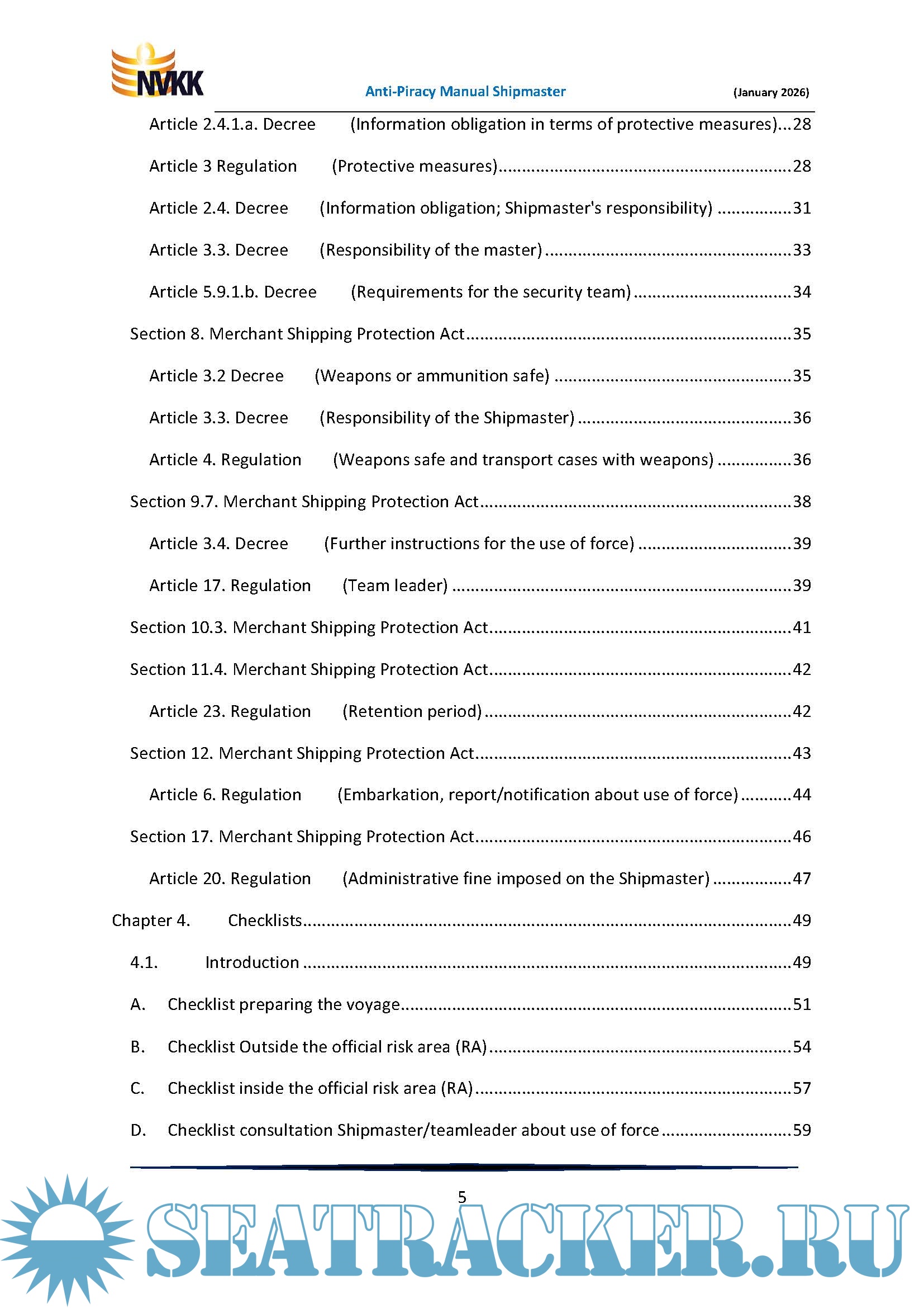 The core of this Manual is formed by a number of uniquely numbered checklists to make sure the shipmaster does not forget anything. Furthermore, a number of important subjects are discussed, such as the use of force, notifications and reports, fines, etc.