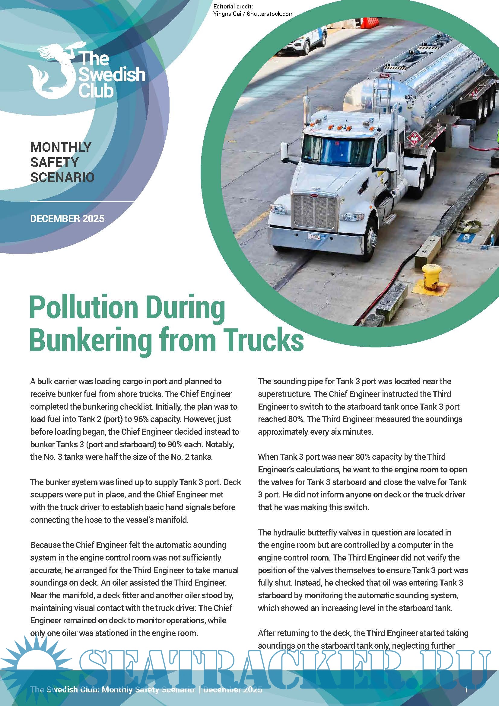 Issue December, 2025 | Pollution during bunkering from trucks. In this month’s MSS Case, we learn about an incident where a bulk carrier experienced an oil overflow during bunkering when the Third Engineer switched tanks without informing the deck team and failed to verify that the valve to the original tank had fully closed.