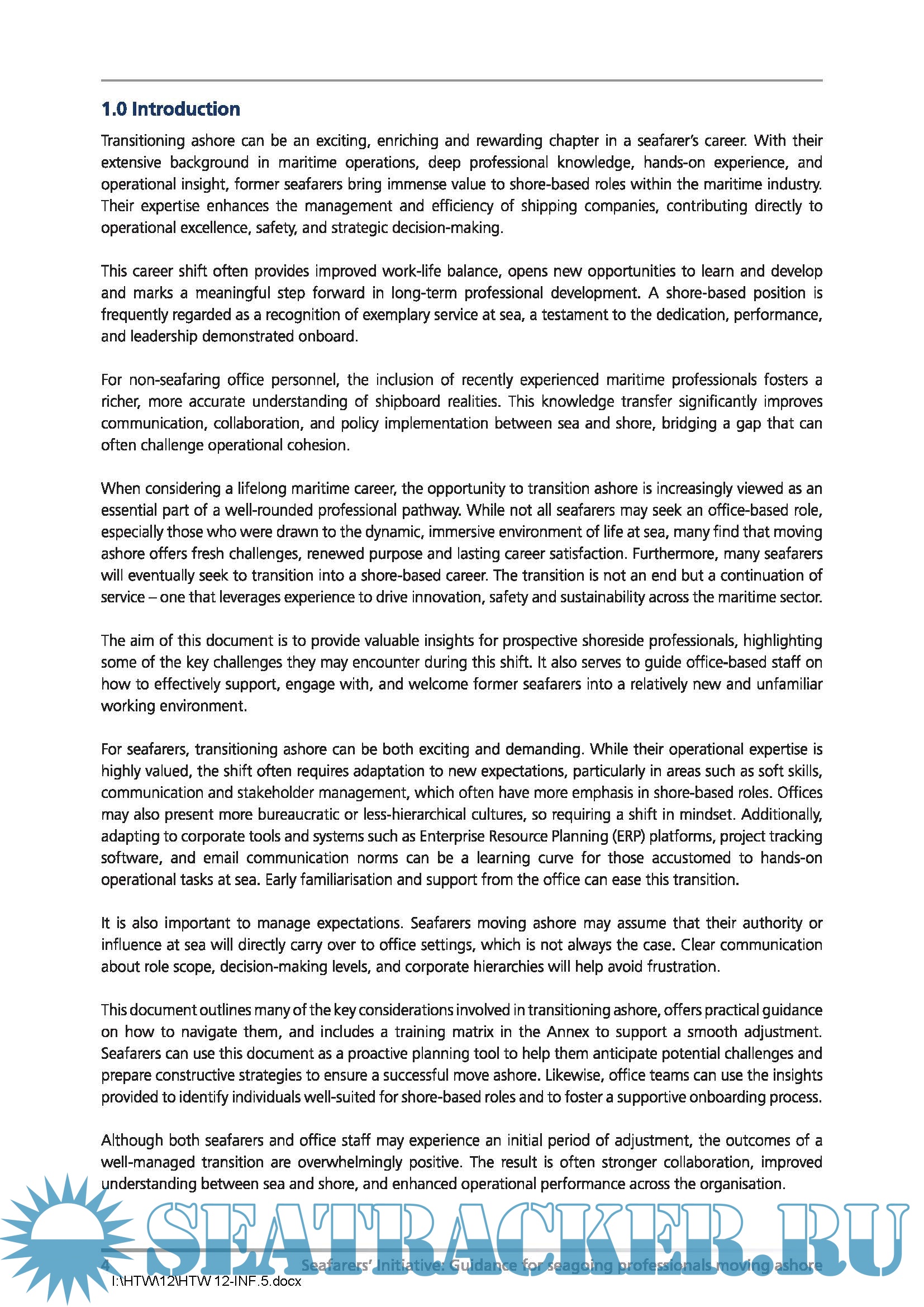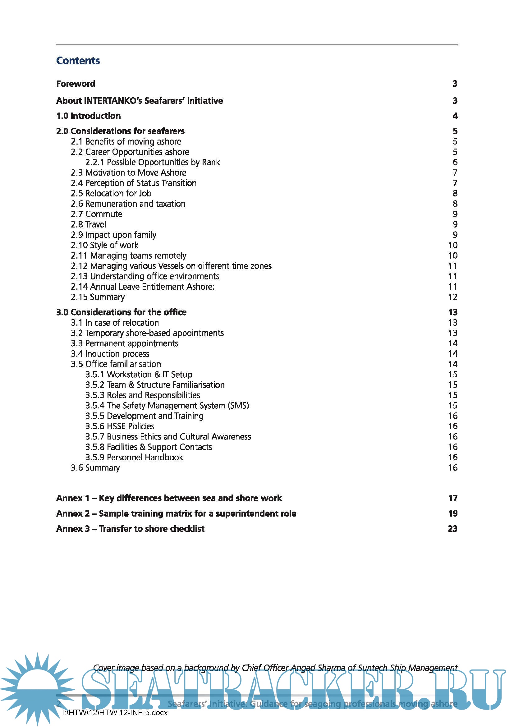 Year: 2025 Language: English Author: INTERTANKO Genre: Other Publisher: INTERTANKO Edition: 1st Format: PDF Quality: eBook Pages count: 26 Description: Transitioning ashore can be an exciting, enriching and rewarding chapter in a seafarer’s career. With their extensive background in maritime operations, deep professional knowledge, hands-on experience, and operational insight, former seafarers bring immense value to shore-based roles within the maritime industry. Their expertise enhances the management and efficiency of shipping companies, contributing directly to operational excellence, safety, and strategic decision-making. The aim of this document is to provide valuable insights for prospective shoreside professionals, highlighting some of the key challenges they may encounter during this shift. It also serves to guide office-based staff on how to effectively support, engage with, and welcome former seafarers into a relatively new and unfamiliar working environment.