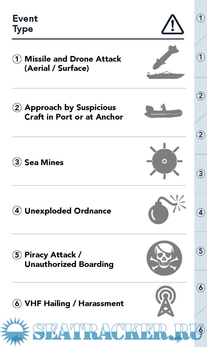 Description: The Joint Maritime Information Center has released an updated set of quick reference 'bridge cards’ for the Middle East region. The cards cover a wide range of potential security events in this region and can help masters and crews prepare for and respond to incidents.
