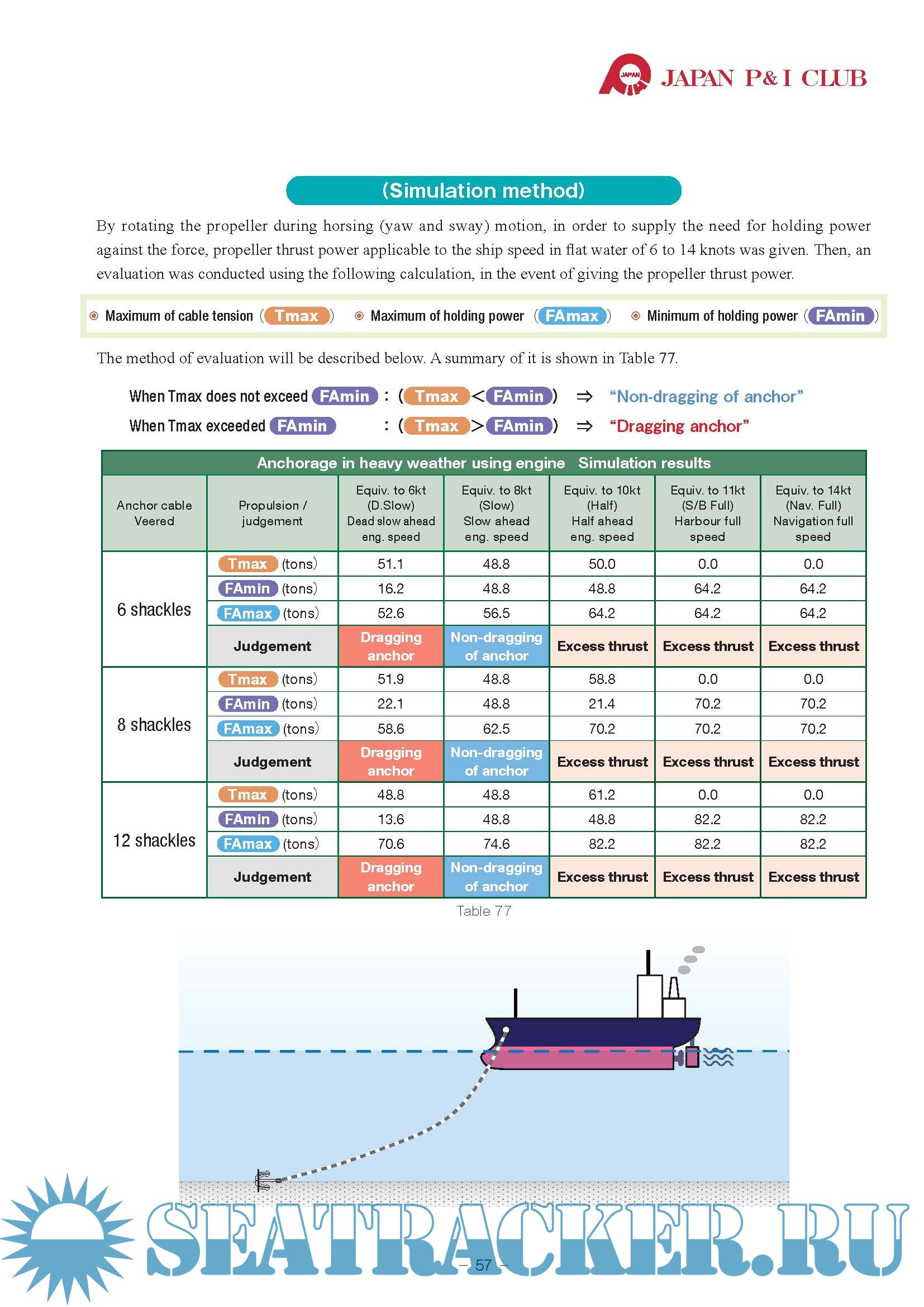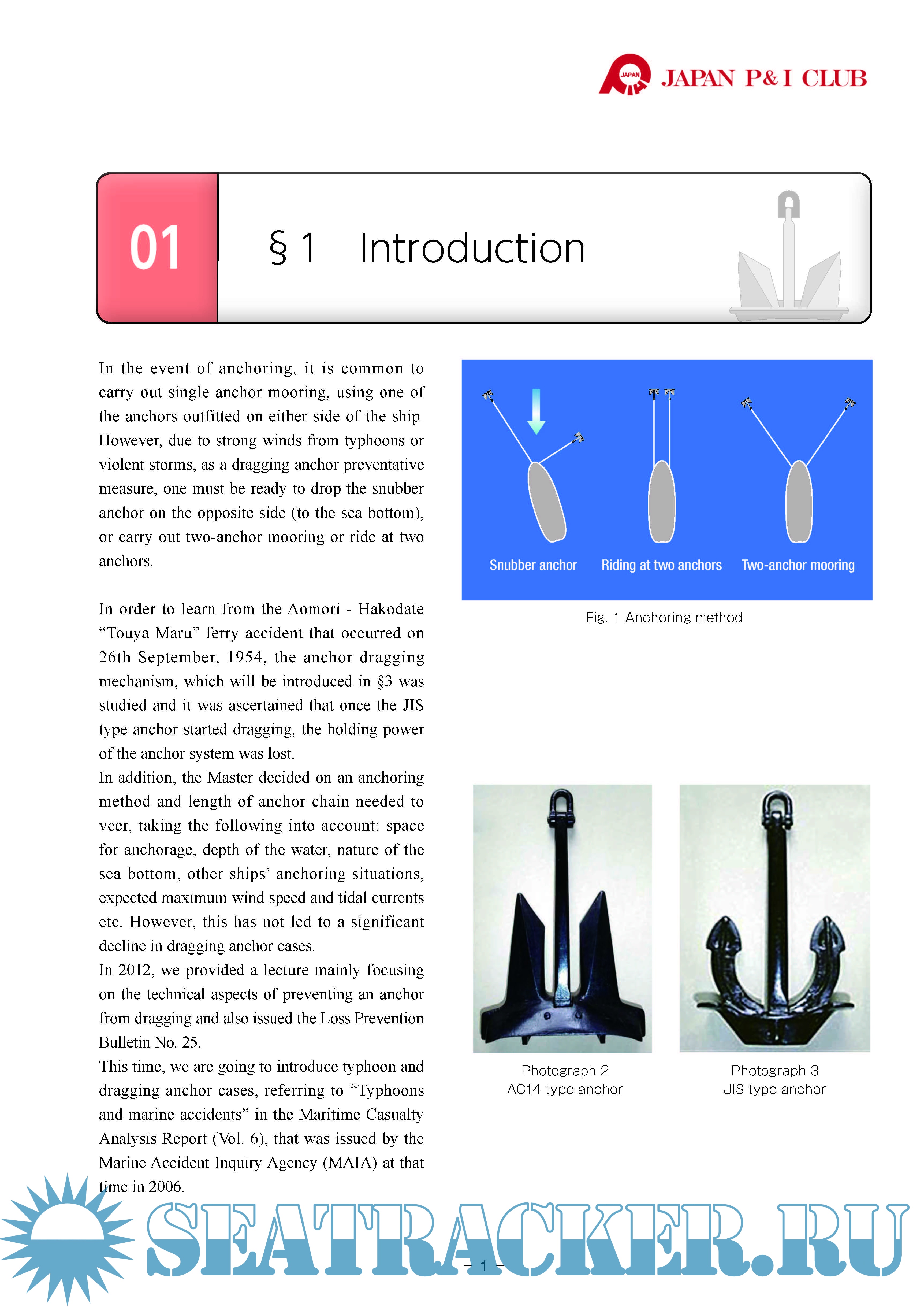 Year: 2018 Language: English Author: Japan P&I Club Genre: Bulletin Publisher: Japan P&I Club Edition: Volume 43 July 2018 Format: PDF, XLSx Quality: eBook Pages count: 66 Description: P&I Loss Prevention Bulletin | Dragging Anchor - Case Studies and Preventive Measures In the event of anchoring, it is common to carry out single anchor mooring, using one of the anchors outfitted on either side of the ship. However, due to strong winds from typhoons or violent storms, as a dragging anchor preventative measure, one must be ready to drop the snubber anchor on the opposite side (to the sea bottom), or carry out two-anchor mooring or ride at two anchors. Accidents due to a dragging anchor are not only caused by Typhoons, but also occur during gales. However, according to statistics they predominantly occur when a typhoon has just passed. First, it is necessary to understand how typhoons move. * Anchoring Holding Power Calculation in .xlsx format included.