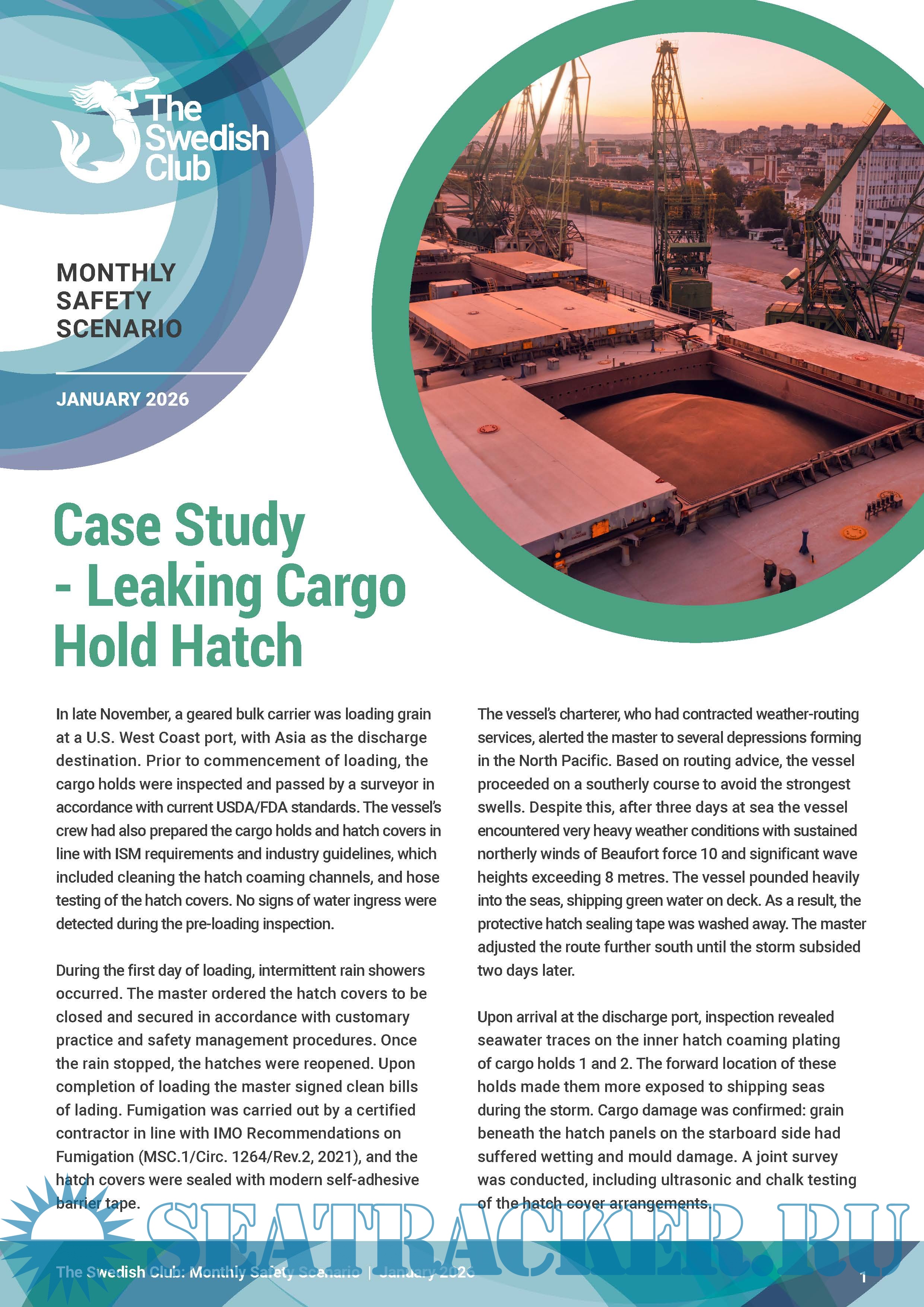Year: 2026 Language: English Author: the Swedish Club Genre: Bulletin Publisher: the Swedish Club Edition: January 2026 Format: PDF Quality: eBook Pages count: 3 Description: The Club is publishing, every month, a new Monthly Safety Scenario (MSS) to assist owners in their efforts to comply with the above regulations. Alternative scenarios will be uploaded in SCOL. It is easy to download the MSS and enter the written conclusions from the meeting and send feedback to the shore-based organisation. Issue January, 2026 | Case study – Leaking cargo hold hatch. | After departing the U.S. West Coast with grain cargo and clean bills of lading, a bulk carrier encountered severe weather in the North Pacific. Heavy seas compromised hatch cover sealing, leading to seawater ingress and cargo damage in forward holds. Subsequent inspection identified leaking hatch cover joints and deteriorated sealing rubbers.