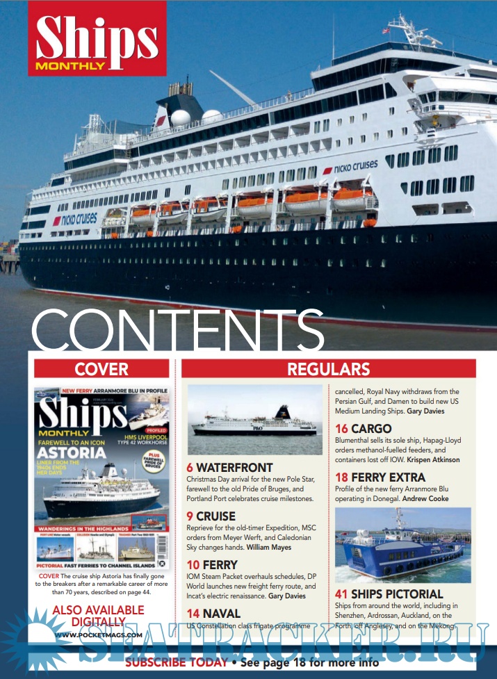Description: Ships Monthly is the world's leading international shipping magazine. Ships Monthly provides news and features for ship enthusiasts and maritime professionals, including reports on the ferry, cruise, new building and cargo ship scene as well as navies across the world.The latest issue of Ships Monthly is out now, and is packed with all the usual news and features, including outstanding articles and features.