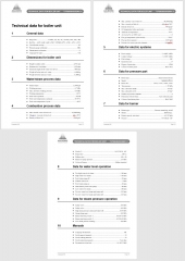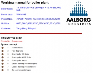 A separate section covers boiler plants, steam systems, and heat exchange equipment. The manuals include instructions for safe boiler operation, fuel and air regulation, pressure and temperature monitoring, cleaning and blowdown procedures, and scheduled maintenance routines. Steam line diagrams, fuel supply layouts, and auxiliary boiler equipment schematics are also included.