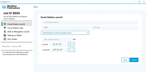 Description: List IV contains important information for the mariner in relation to radiocommunications, including the GMDSS (Global Maritime Distress and Safety System). Detailed information such as the frequencies for transmitting and receiving, in addition to geographical coordinates, is provided for maritime coast radio stations, including those assuming watch-keeping using digital selective calling (DSC) techniques and radiotelephony. List IV also supplies details of additional services such as medical advice, navigational and meteorological warnings, MSI (Maritime Safety Information), AIS (Automatic Identification System), meteorological bulletins and radio time signals, along with the hours of service and operational frequencies, information on port stations, pilot stations, coast Earth stations, VTS stations, contact information of RCC (Rescue Coordination Centers), SAR agencies, Navarea coordinators and AtoNs (AIS Aids to Navigation).