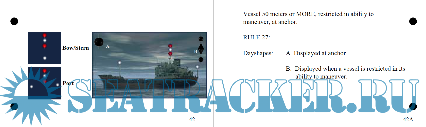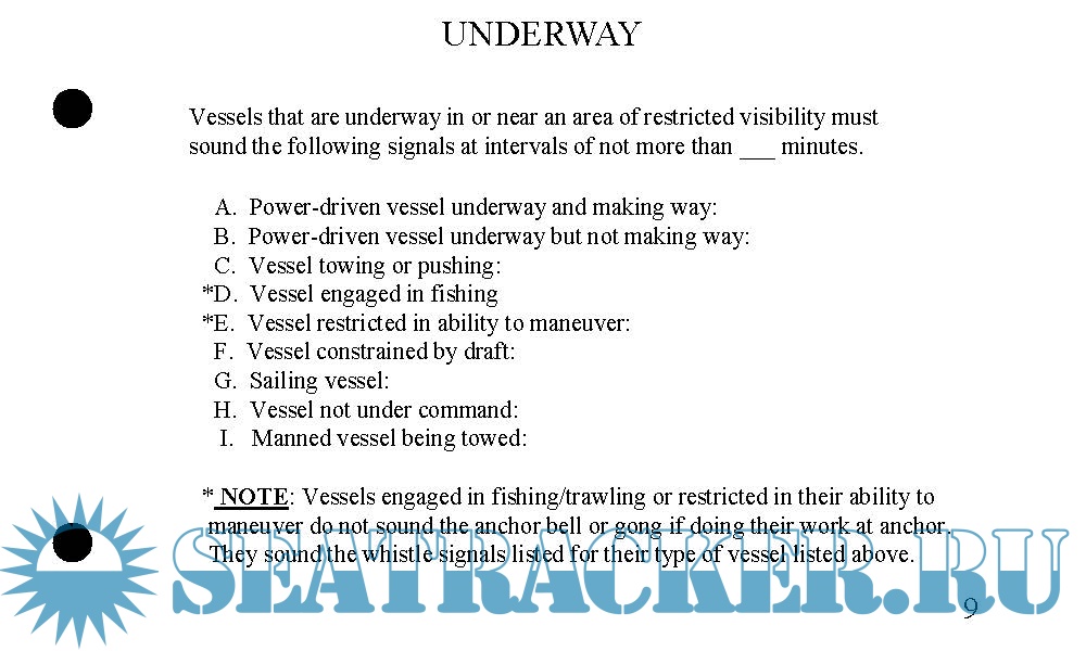 A deck of flashcards depicting the 62 rules of the road relevant to the rules portion of the U. S. Coast Guard license exams. Answers on the back of each card. Covers lights, shapes, steering rules, signals.