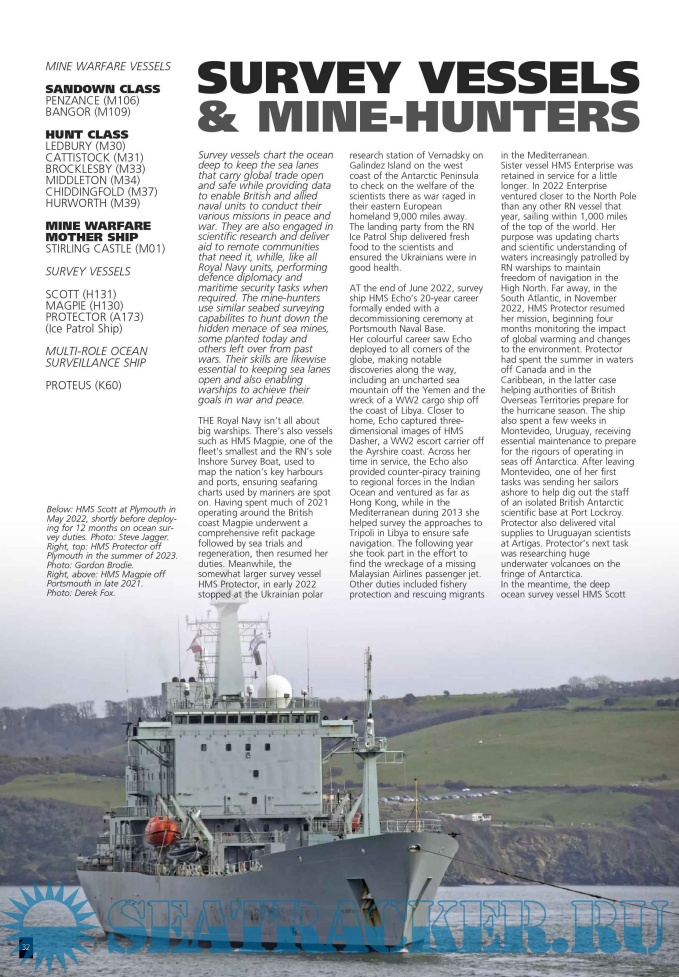 There are ship profiles (including details of recent front-line missions and also refits that maintain vessels on the cutting edge). The components of the fighting fleet are divided up into: Submarines, Amphibious Ships, Mine Warfare and Survey Vessels, plus the Royal Fleet Auxiliary and Patrol Vessels, each with dedicated imagery.