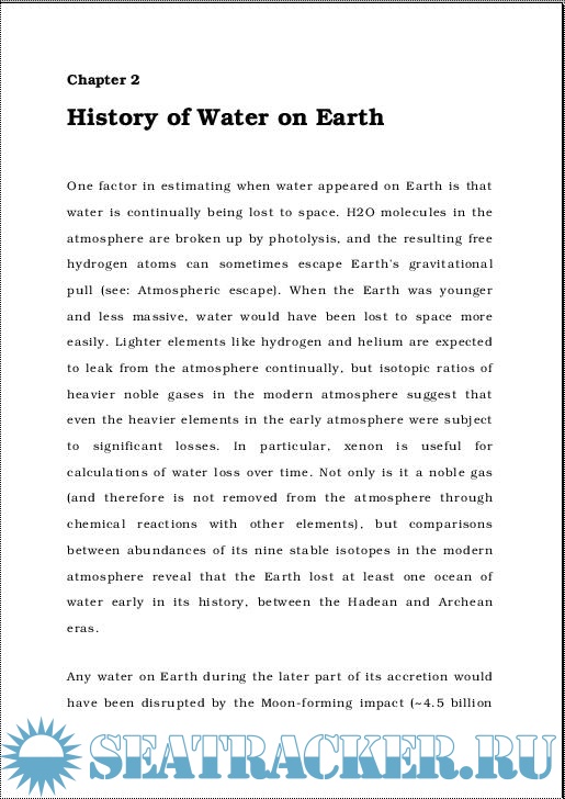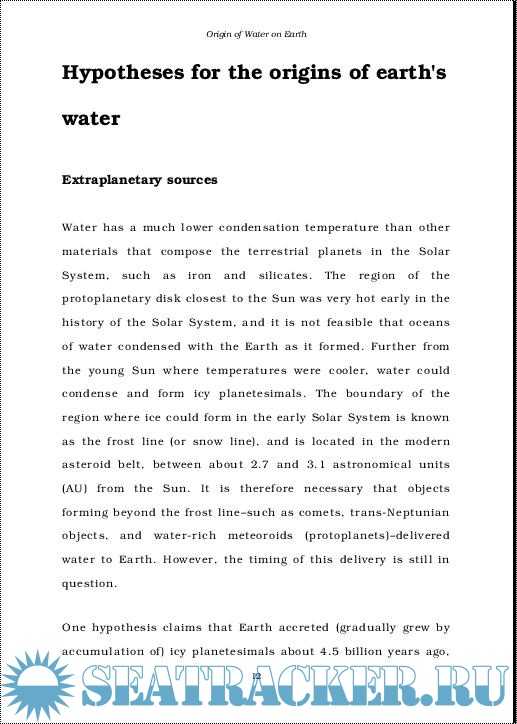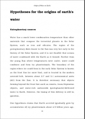 Description: The origin of water on Earth, or the reason that there is clearly more liquid water on the Earth than on the other rocky planets of the Solar System, is not completely understood. There exist numerous more or less mutually compatible hypotheses as to how water may have accumulated on the earth’s surface over the past 4.6 billion years in sufficient quantity to form oceans.