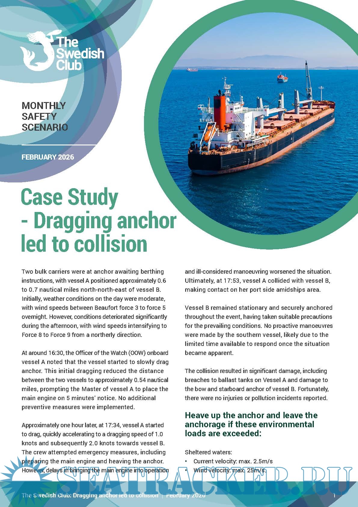 Issue February, 2026 | Case study – Dragging anchor led to collision. | Two bulk carriers collided after vessel A dragged anchor in worsening weather conditions. Delayed engine response and ineffective maneuvering led to significant damage, though no injuries or pollution occurred.