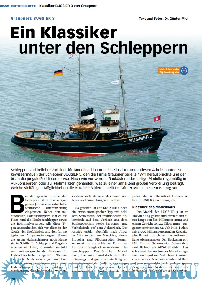 Year: 2017 Language: German Author: Mario Bicher (Redaktor) Edition: 2017-04 Format: PDF Quality: eBook Pages count: 76 Description: SchiffsModell is the magazine for those who enjoy radio controlled and fully functional Modellnachbauten of ships of all kin