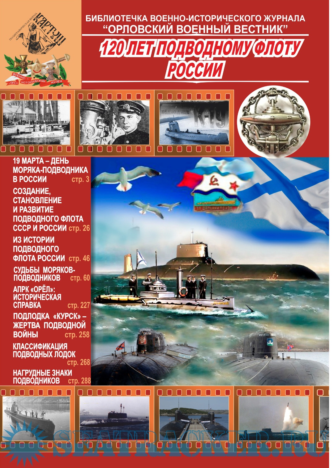 Описание: Специальный выпуск военно-исторического журнала «Орловский военный вестник» с 2016 года выходит в новом исполнении: Библиотечка «Орловского военного вестника».Этот выпуск посвящён 120-летию подводного флота России.Читатель сможет ознакомиться с историей возникновения и развития подводного флота России–СССР–Российской Федерации, с той ролью, которую исполняет подводный флот в современном противостоянии сверхдержав.Конечно же, подробно мы остановимся на судьбах подводников – уроженцев Орловщины и тех, кто после службы предпочёл связать свою судьбу с городом Орёл.