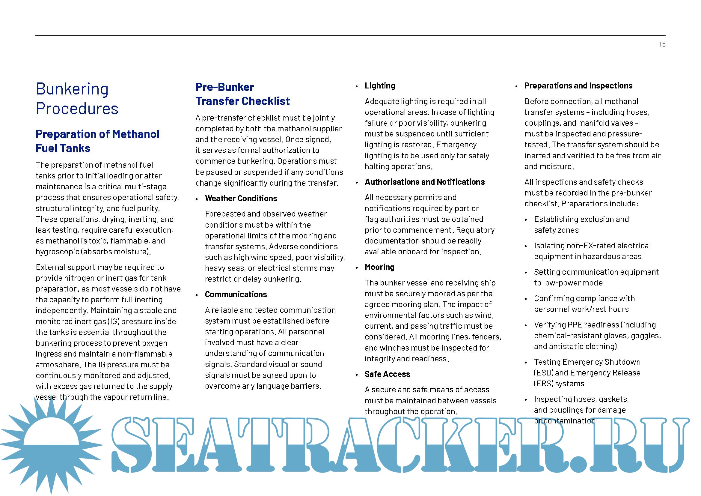 In addition, the guide addresses commercial and training considerations, including fuel quality and quantity requirements, custody transfer arrangements and crew competency standards under the STCW and IGF Codes. Together, these elements support shipowners, operators and crews in managing the risks associated with methanol bunkering while enabling its safe and effective integration into vessel operations.