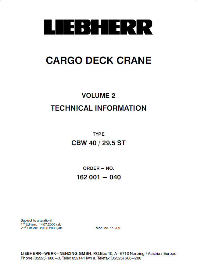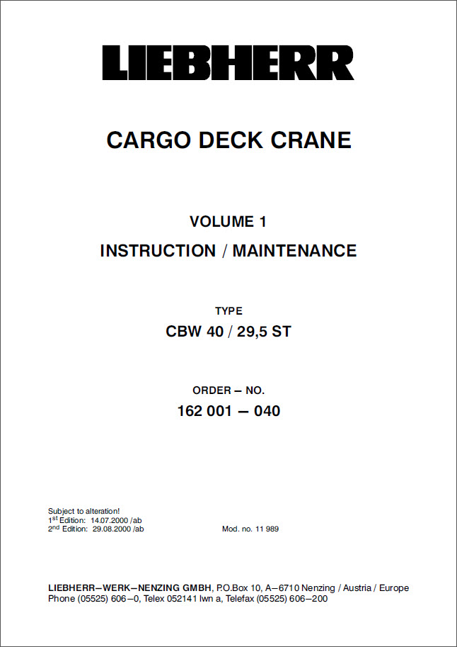 LIEBHERR Cargo deck crane CBW 40 / 29,5 ST / INSTRUCTION AND MAINTENANCE MANUAL +TECHNICAL INFORMATION