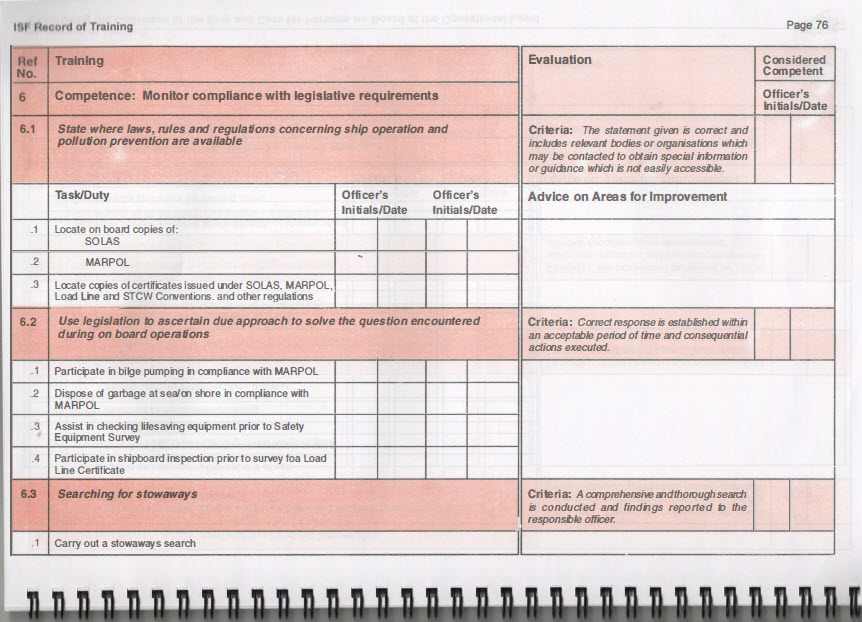 Completion of this Book will not itself constitute an official assessment of competence. This is the task of government appointed examiners. However, completion of the ISF On Board Training Record Book should provide sufficient documentary evidence that a cadet has completed a properly structured on board training programme and demonstrated competence in the skills required by the amended STCW Convention.