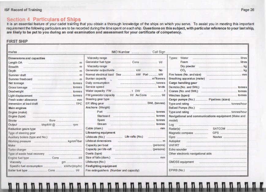 • The cadet should complete Section 4 (page 26) concerning the technical details of the vessel. The chief engineer and the designated training officer on board each ship should provide an opportunity for this exercise to be undertaken.