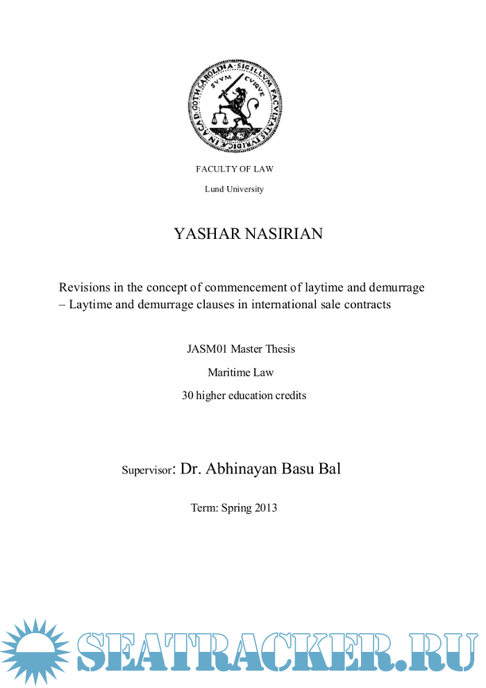 Year: 2013 Language: english Author: Yashar Nasirian Genre: Research papers, Master Thesis, Maritime Law Publisher: Lund University Edition: Spring 2013 Format: PDF Quality: eBook Pages count: 100 Description: Voyage charterparties, as one of the most common carriage contracts, has its own specific provisions which govern the legal relationship of the engaged parties. One of those specifications relates to the concept of laytime which is defined as the time during which the charterer can load or discharge the cargo. In this work the author tries to discuss the requirements that should be fulfilled to commence the laytime under different contractual situations and the problematic matters which are related to these provisions. In addition, the different types of laytime and its exceptions besides the concept of demurrage and despatch, which are related to the concept of laytime when the charterer cannot perform the loading or discharging operation on time or when he performs it sooner than agreed time, are discussed. Also, the incorporation of the laytime and demurrage clauses in the international sale contracts and charterparties and their interpretation are discussed under the legal systems of England and the USA as the second part of this work to analyse these two major systems based on a comparative method.